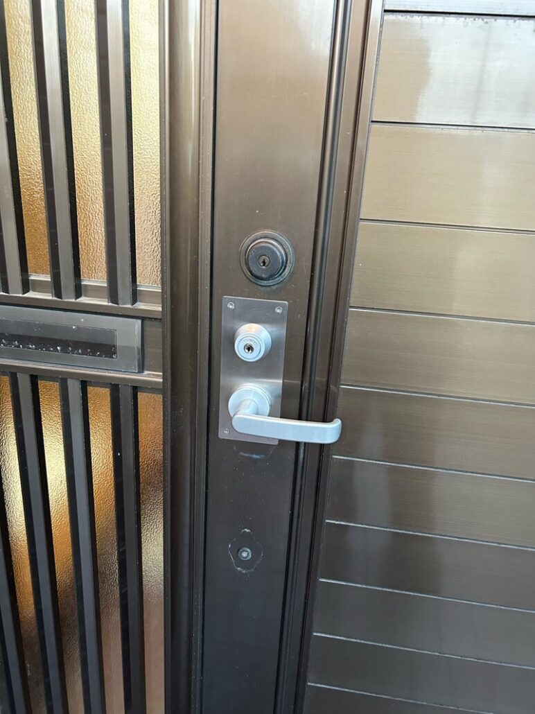 まだ、廃盤ではないので同じサムラッチ錠に取り替え可能ですが、いずれ廃盤になるし使いにくいので廃盤になることはまずない、美和のレバー錠に加工してとりかえ、使いやすくかっこいいとお客様も満足されてました
